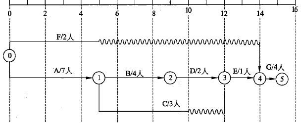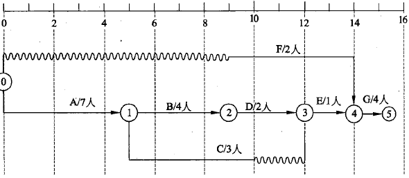 可识别出关键路径为:A—B—D—E-G工期为15天。调整非关键路径上的活动,使得各路径上并行活动人数最少的方案如下图。