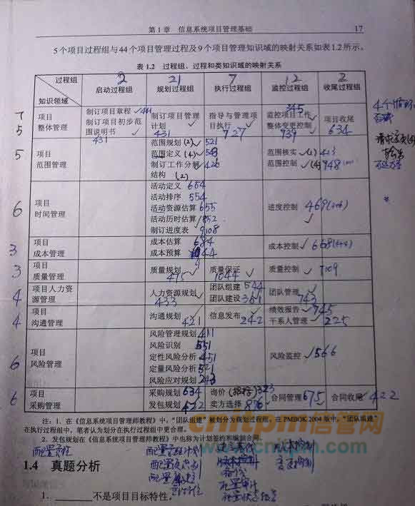 首先,结合九大知识领域与软件开发的五个过程组(启动过程组、规划过程组、执行过程组、监控过程组和收尾过程组)相对应的关系为基础。将教材中的如下表格扫描件,作为一条总线,将九大知识领域与开发过程组串起来;