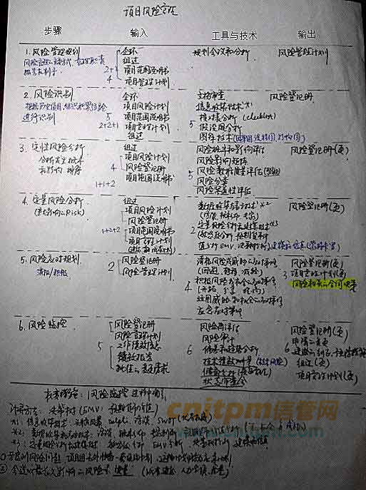 其次,对九大知识领域进行ipo(input,process,output)整理,每个过程整理在一张纸内,然后考试前的一周,每天早上起来和晚上睡前看记一遍,实在是背功太差 l。下面展示一张我手写的关于风险管理的实例: