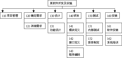 一般常用工作分解结构(WBS)的方法来实现,确保找出完成项目工作范围的所有工作要素,同时描述可交付成果和其组成要素的具体内容。这里主要针对阶段目标或里程碑目标,项目范围确定后就为项目活动的界定提供了依据。