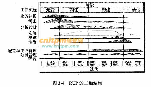 RUP的开发过程可以用二维结构或沿着两个坐标轴来表达,如图34所示。