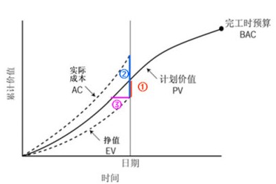 挣值管理是一种综合了范围、时间、成本绩效测量的方法,通过与计划完成的工作量、实际挣得的收益、实际的成本进行比较,可以确定成本进度是否按计划执行。下图中标号所标示的区间依次应填写( )。