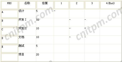 比如从事一个简单的项目,这个项目包括这样几个任务,第一个任务是项目的设计,通常需要10周的时间,如果按50%的可能性进行估计,把估算的时间压缩一半,即5周内完成。第二个任务是两个阶段的开发工作,即开发一和开发二,假设每个开发的工作都需要大约20周的时间,我们在估算中分别给它安排10周,也就是说大概有一半的概率可以在10周内完成。类似的我们把剩下的工作——项目的文档工作也按照一个比较严格的估计——10周,项目的测试工作也是5周,这样我们把隐藏的裕量都予以扣除。如果在不考虑资源限制的情况下,这个项目的顺序应该是设计、开发、文档工作、项目的测试,按照关键链法进行估算,这个项目的完成时间总数只需要20周。这是一个非常严格的估算,很可能相应工作在实现周期内是不能完成的,还要进一步用关键链法来进行管理和控制,如下表。