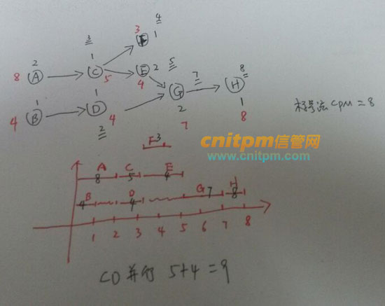 可以先确定关键路径ACEGH一共8周,人力还需要画图