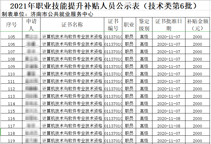 考取软考证书之后可以领取一些补贴。有的公司会有一些补贴制度,有些地区会有“技能提升”补贴,比如以下显示的便是济南2021年职业技能提升补贴人员公示表(技术类第6批)中关于软考高级的补贴部分人员名单。