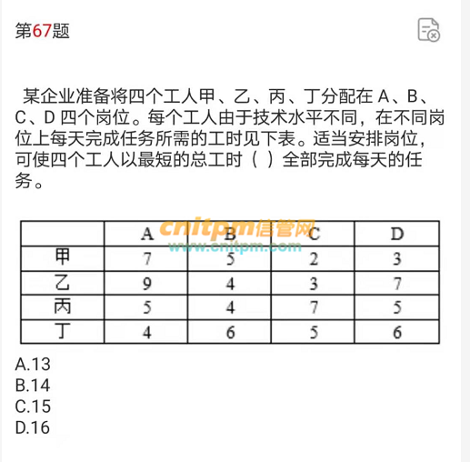 对于甲,最小的是C工作的2,乙最小的也是C工作的3,丙最小的是B工作的4,丁最小的是A工作的4。然后因为甲乙对应的最小都是C,所以重复了,那么再找相对更小的甲对应的D,加起来就是3+3+4+4=14
