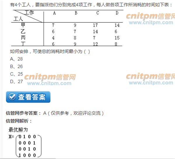 最终是甲做B ,乙做D ,丙做C,丁做A ,得出9+6+7+6= 28