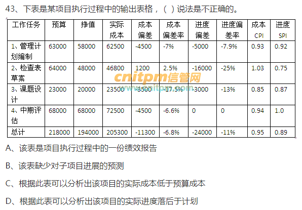这题要选明显不对的,C成本偏差CV=EV-AC =-1130 小于0 是成本超支。