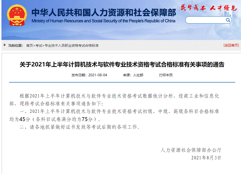 2021骞?鏈?鏃ワ紝浜哄姏璧勬簮绀句細淇濋殰閮ㄥ姙鍏巺鍙戝竷閫氬憡锛屾槑纭?021骞翠笂鍗婂勾璁$畻鏈烘妧鏈笌杞欢涓撲笟鎶€鏈祫鏍艰€冭瘯鍚勭鐩悎鏍兼爣鍑嗗潎涓?5鍒嗭紒