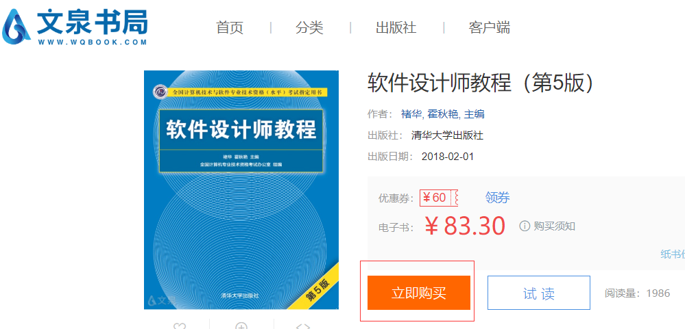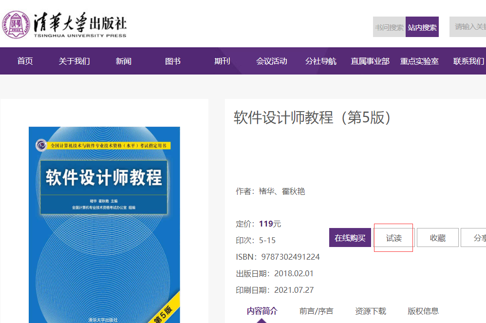 软件设计师教程(第5版)由清华大学出版社出版,全国计算机专业技术资格考试办公室组编,褚华、霍秋燕主编,为软件设计师考试官方指定教程,考生可在清华大学出版社搜索“软件设计师教程”进行在线试读,并购买电子版书籍,步骤如下: