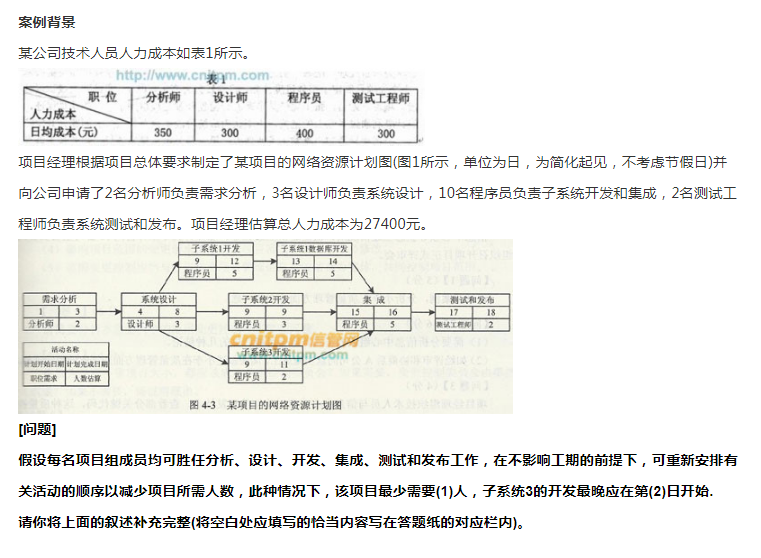 子系统2是可以1人3天完成的,第3题,调整的关键是把子系统3调整到第12天开始,画出时标网络图来就能得出各个时间段的人数