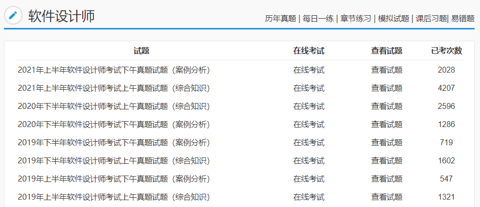 选择软件设计师频道进行免费在线做题,模拟考场环境,让考生提前适应考试节奏,栏目服务项目包括每日一练、章节练习、模拟试题、历年真题等,供广大考生进行选择。(点击进入,在线题库)