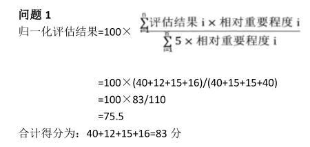 归一化结果=合计得分/(评估级别最高级x单位级别累计)x百分比 =(5x8+4x3+5x3+2x8)/5x(8+3+3+8)=(40+12+15+16)/(5x22)=83/110x100=75.45分