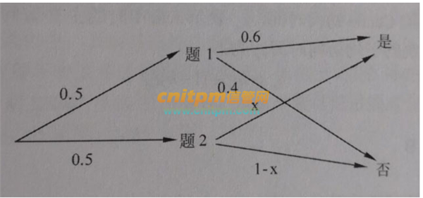 回答是的比例等于0.5 * 0.6+0.5★x=0.35 ( 0.5表示选题器选择题1和题2的概率相同), 因此x=0.35*2-0.6=0.1