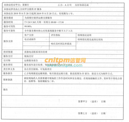 某银行是一家上市的商业银行,随着银行综合实力的日益增强和自身规模的不断扩大,信息化建设工作也不断创新。经过一系列改革措施后,随着银行业务的稳步前行,给IT部门带来了极大的工作量。 由于缺乏统一的运维管理,随着客户服务请求数量不断增多,导致业务部门意见很大。为了尽快改善被动局面,最终通过招标形式由A公司为其提供运维服务。该公司服务经理对本运维服务进行规划设计,通过对服务进行可用性、连续性、服务报告、服务能力、安全等方面的需求识别,提供了服务级別协议初稿,制定了相应的服务方案,经过各方干系人的审核后,最终签订了 SLA。A公司进一步向客户承诺要提供全面满意的运维服务,此后,在各方支持下运维工作得以顺利展开。