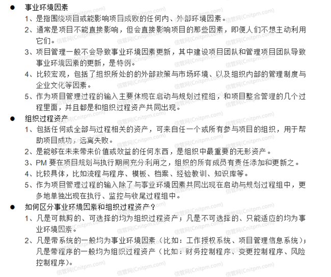 2、一般带系统的一般均为事业环境因素(比如:工作授权系统、项目管理信息系统);凡是带程序的一般均为组织过程资产(比如:财务控制程序、变更控制程序、风险控制程序)。