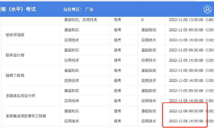 从上图我们可以看到,的确2022年下半年系统集成项目管理工程师考试从以前的11月5日变动到了11月6日举行,而全国其它地区的系统集成项目管理工程师考试时间仍然是11月5日,参考上半年广东的情况,如果考试设置在11月6日举行,那么广东2022年下半年系统集成项目管理工程师考试的确又将要“单独命题、独立考试”。
