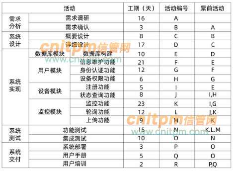 某视频监控系统,项目活动如下表所示,则该项目中,(1)活动不需要在监控模块上传功能(M)活动完成前必须完成。项目总工期是(2)天。由于负责设备权限功能(H)研发的小王临时出差,导致该功能工期延长了9天,则项目总工期延期(3)天。【转自JRS直播(fzyzx.cn)】