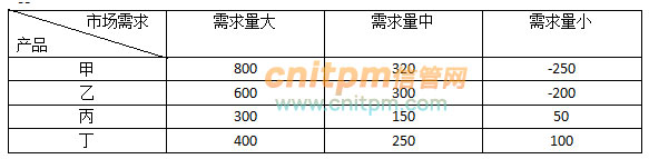 某公司为经营业务的需要,决定要在现有生产条件不变的情况下,生产一种新产品,现可供生产的产品有甲、乙、丙、丁四种类型。由于缺少相关资料背景,对新产品的市场需求只能估计为大、中、小三种状态,在不同的市场需求条件下,新产品的收益值如表所示,如果决策者采用后悔值方法进行决策,该公司应生产()。【转自JRS直播(fzyzx.cn)】