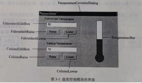 图3-1所示为某软件系统中一个温度控制模块的界面。 界面上提供了两种温度计量单位,即华氏度(Farechet)和摄氏度(Celsius)。软件支持两种计量单位之间的自动换算,即若输入一个华氏度的温度,其对应的摄氏度温度值会自动出现在摄氏度的显示框内,反之亦然。
