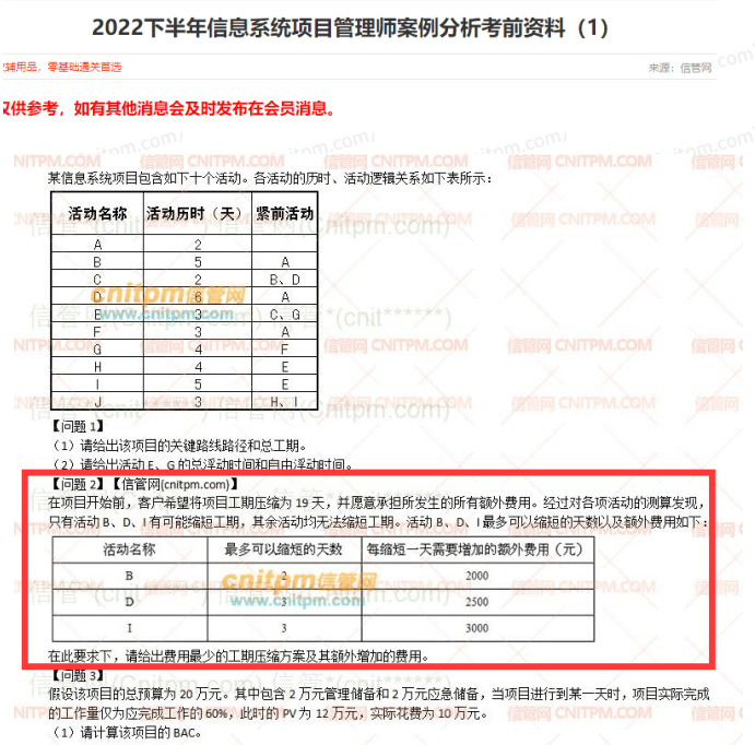 对于案例计算题,虽然画双代号网络图可能部分考生不知道画,但是画图部分分值很少,只有4分,所以对分数是不会有太大影响的。而对于工期压缩,我们在考前给出的案例分析考前资料里第一个题目就是一个工期压缩的题目。