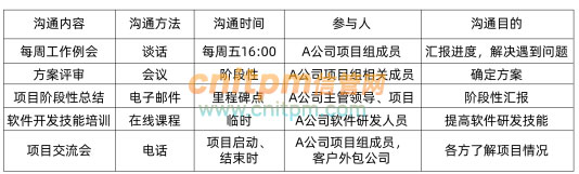 在制定项目管理计划过程中,小张让负责研发的小陈制定沟通管理计划,作为项目管理计划的子计划。小陈认为编制沟通管理计划是一件重复性的工作,于是参考过去的项目管理计划,简单进行了修改后放入了项目计划文件夹下作为公共信息供大家查阅,完成后的沟通管理计划表如下: