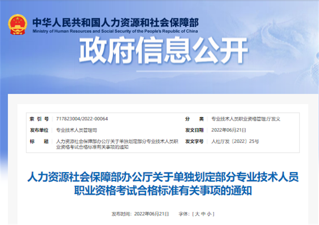 其次是《人力资源社会保障部办公厅关于单独划定部分专业技术人员职业资格考试合格标准有关事项的通知》。