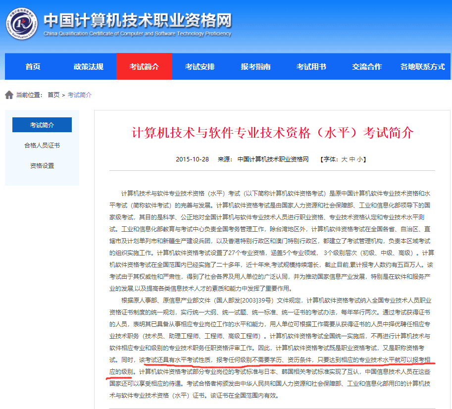 国家职业资格计算机技术与软件考试里的信息系统项目管理师高级不像其他很多考试一样需要具备比如学历专业、工作年限等的限制,根据中国计算机技术职业资格网关于计算机技术与软件专业技术资格(水平)考试简介,考试具有水平考试性质,报考任何级别不需要学历、资历条件,只要达到相应的专业技术水平就可以报考相应的级别。不需要学历条件就是说你哪怕初中学历或者没上过学都可以去考,而不需要资历条件其实就是不需要工作经验这些条件,而要达到相应的专业技术水平具体是要达到什么水平并没有一个考核的标准,只要你认为你达到了这个水平就可以去报考。