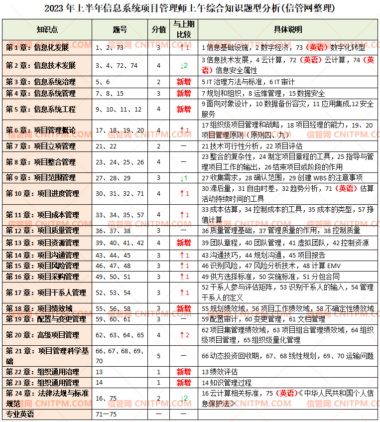 信息系统项目管理师考试知识点分布广,范围宽,涉及到信息化及信息技术、信息系统的治理和管理、项目管理知识、项目绩效域、高级项目管理、组织级项目管理知识、项目集管理、项目组合管理、管理科学基础知识、法律法规知识、专业英语知识等内容。就2023年上半年高级信息系统项目管理师考试来说: