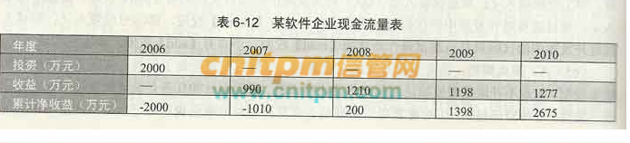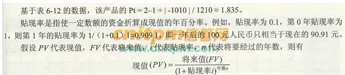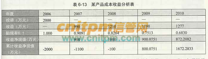 某年的净现值是指该年利润值乘以当年贴现系数。基于表6-6的数据,该产品的成本收益分析表如表6-13所示。