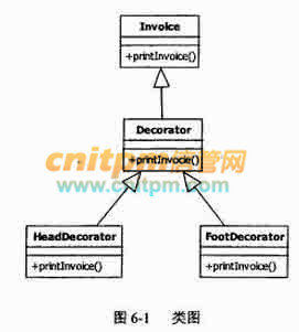 某发票(lnvoice)由抬头(Head)部分、正文部分和脚注(Foot)部分构成。现采用装饰(Decorator)模式实现打印发票的功能,得到如图6-1所示的类图。
