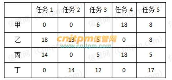分配甲、乙、丙、丁四个人去完成五项任务。每人完成各项任务时间如表所示。由于任务多于人数,故规定其中有一个人可兼完成两项任务,其余三人每人完成一项。为了花费时间最少,()应该完成两项任务。