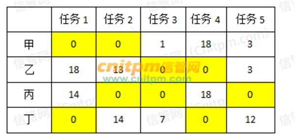 第三步:“0”元素所对应的任务就是每个人的最优任务。根据最优任务可以有如下方案: