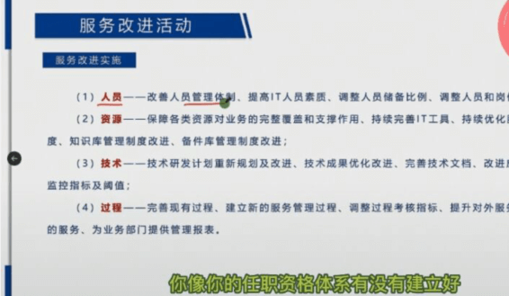你看它下面就是完善IT工具,优化服务台管理制度啊,改进知识库管理制度,改进备件库管理制度,那技术技术刚才我们说了,也就包括那些技术研发是吧?如果你的技术研发没有实用性怎么办?那你就吃,那你就重新规划啊那个重新规划那你技技术成果运用啊,如果你的技术成果发现并匹匹配或者运并并完全全者技技术成果有漏洞,那怎么办?对技术成果进行改进?对记录文档进行完善啊,你的应急预案,你的监控指标及阈值?这些都是相应的是什么?相应的是运营管理里面你相对应技术有哪些东西,那你就把它拿来服务改进实施里面啊,我对应这些东西我就要做什么,就要做改进,所以这一章其实跟上一章是对应的关系啊。
