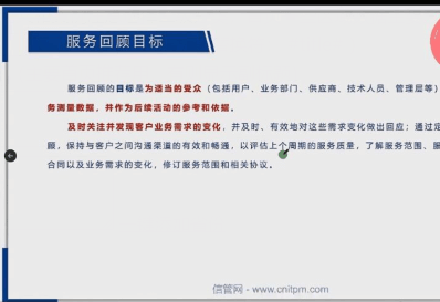 他呢,就作为后续活动的一个参考和依据啊,在这个环节呢,大家要注意是什么呢?注意的是及时关注并发现客户业务需求的变化,及时有效的对这些需求变化做出回应,通过定义的服务回顾,保持与客户之间沟通渠道的有效畅通,有效的畅通,评估上个周期的服务质量,了解服务范围、服务级别、协议、合同以及业务需求的变化,修订服务范围和相关协议,这些都是看一下就行了,其实它是什么呢?服务回顾的目标是什么呢?他就是跟项目干系人,回顾你收集到的各种或者说你测量到的各种数据啊,作为后续参考,作为后续改进活动的一个参考。