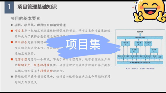 项目组合和什么呀,运营管理啊,项目我们指的是单项目,单项目一个项目呢,就指产生一个交付成果,是吧那么什么是项目集呢。