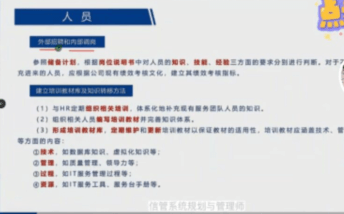 经常考试呢会考这三个词,人员储备计划、岗位说明书、知识技能经验。尤其是知识技能经验这三个呢是所有it服务人员衡量IT服务人员能力的一个核心标准啊,就是这三方面,这个大家要知道。第二个呢是建立培训教材库及知识转移方法。刚才我们提到了在规划设计阶段,我们设立了一些培训计划,那在部署实施阶段呢,我们就要需要和公司的HR也就是人事定期组织一些培训啊。