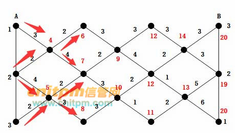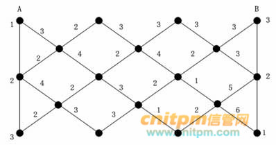 下面的网络图表示从城市A到城市B运煤的各种路线。各线段上的数字表示该线段运煤所需的费用(百元/车)。城市A有三个装货点,城市B有三个卸货点,各点旁标注的数字表示装/卸煤所需的费用(百元/车)。根据该图,从城市A的一个装卸点经过一条路线到城市B的一个卸货点所需的装、运、卸总费用至少为()(百元/车)。
