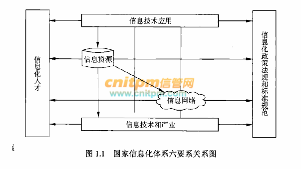 国家信息化体系包括信息技术应用、信息资源、信息网络、信息技术和产业、信息化人才、信息化法规政策和标准规范6个要素,这六个要素按照图1.1所示的关系构成了一个有机整体。