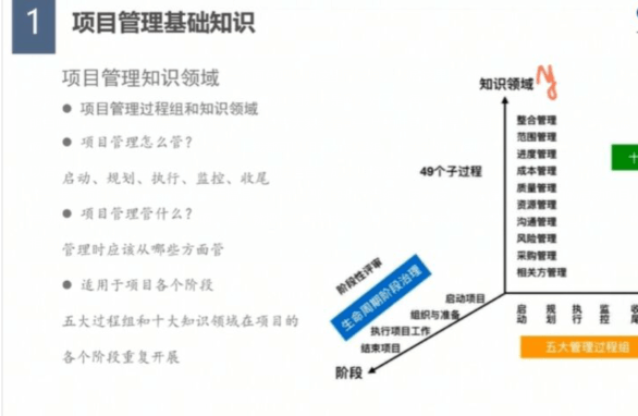 如果有人问你项目管理怎么管呢?你就告诉他,你可以从启动规划至金融再给我收尾数的。这个Y轴呢是按十大领域啊,这条解决了什么问题啊?项目管理我要管什么,对不对?你要管整合、要管范围、要管进度、要管成本、要管沟通是吧?应该从哪些方面管?那么这条这一轴呢就是我们的项目的阶段,也就是生命周期是吧?然后告诉你五大过程组和十大知识领域,在各个阶段是重复开展。