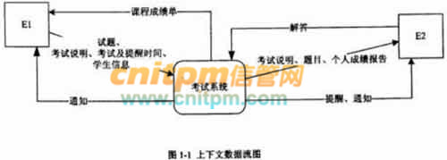 现采用结构化方法对考试系统进行分析与设计,获得如图1-1所示的上下文数据流图和图1-2所示的0层数据流图。