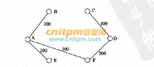 点A、B、E与其他各点C、D、F这两个集合之间的最短距离为AF=BF=300,从而可以将边AF(或点BF)与点F纳入已完成部分。
