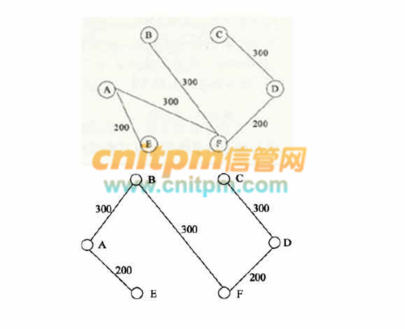 连接着6个点的边至少需要5条,最短总长等于2个200以及3个300.图中共有4条边长300,其中,CD边最短总长度方案中不可缺少,而AE、AB、AF中可以任选2条.因此,共有3个最短总长度的方案。除了上面给出的外,还可以有两种(如下图所示):
