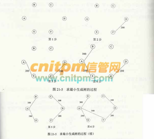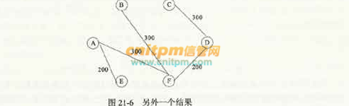 到了第5步,就有多种选择,即可以选择AF,也可以选择BF,因为其路程都是300。我们给出的第6步是选择AF的结果,还有一种结果,就是第4步时,不是选择AB ,而是选择AF或BF,则结果如图21-6所示: