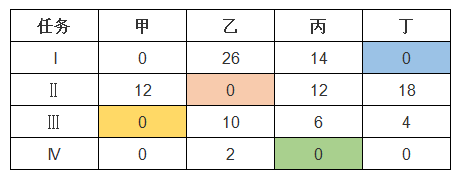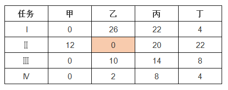 丙所在的列有唯一的0元素,故丙项目组完成iv任务。ⅲ任务所在的行有唯一的0元素,故ⅲ项目由甲项目组完成。剩余丁项目组完成i项目即可。