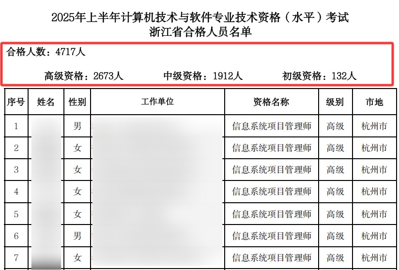 根据浙江省专业技术职务任职资格申报与评审管理服务平台发布的《关于公布2025年高级经济师职称考评结合业务考试、会计专业技术初级资格考试和上半年计算机技术与软件专业技术资格考试合格人员名单的通知》得知,浙江2025年上半年软考合格人员共计4717人,其中初级132 人、中级1912人、高级2673人。