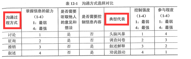 讨论的典型代表是头脑风暴,征询的典型代表是调查问卷,推销的典型代表是叙述解释,叙述的典型代表是劝说鼓动。所以答案选A。