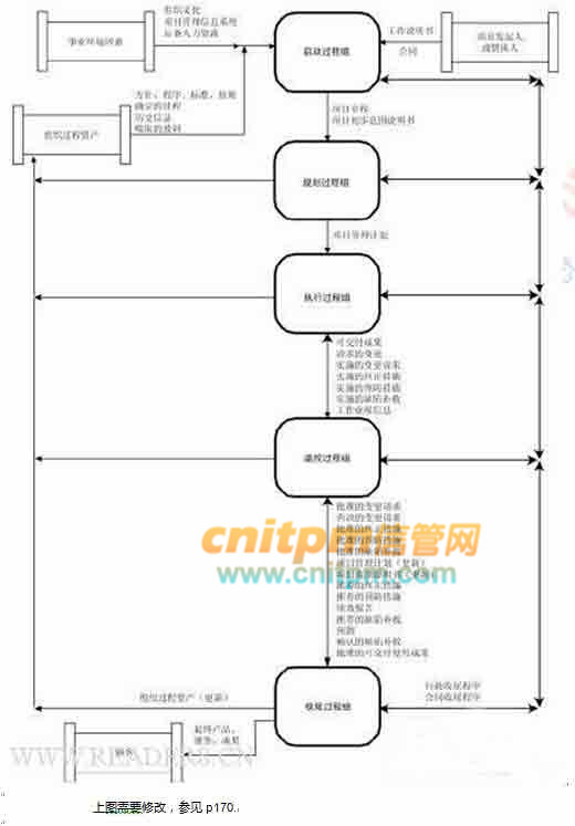 5个项目管理过程组:启动;计划;执行;监督与控制;收尾。这 5个项目过程组具有明确的依存关系,在各个项目中按一定的次序执行,它们与应用领域或特定产业无关。 从整体上看,项目管理过程比基本的 PDCA 循环要复杂的多,但是这个循环可以被应用于项目过程内部及各过程组之间的相互关联。