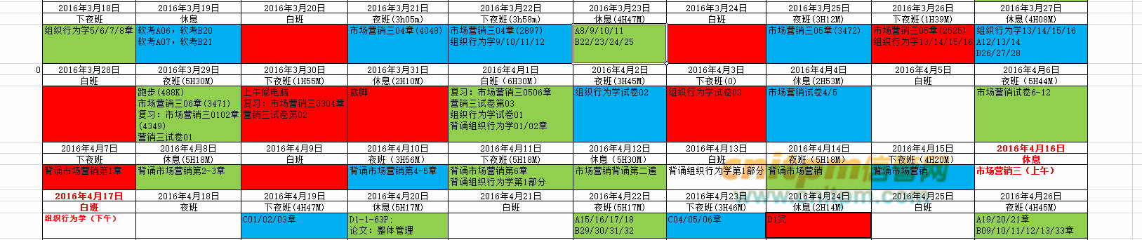 总之,想要提高这门考试的通过率,你应该提早给自己制定一个计划,并认真执行。再给大家分享一张我的每日执行日志,日志包括了我每天的备考进度、复习时间等内容。图中红色的部分是因为我当天的备考时间小于3小时,蓝色的备考时间在3-4小时,绿色的部分备考时间在5小时以上。