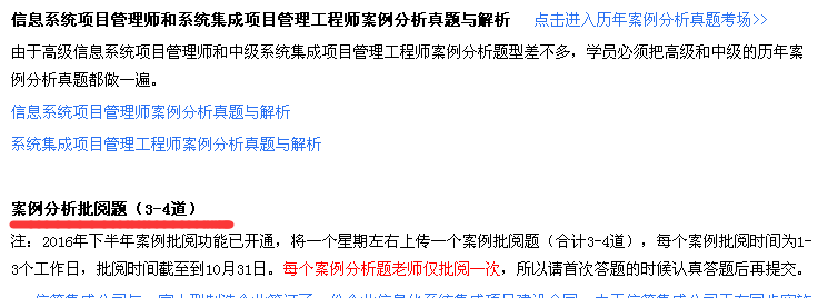 2016下半年信息系统项目管理师、系统集成项目管理工程师培训班案例分析批阅功能已开通(该功能仅信管中高级精品班、保过班、退款班学员可以使用,报名培训),将陆续给出3-4道案例批阅题,各位学员可以在线答题后提交老师批阅,批阅周期一般为1-3个工作日。